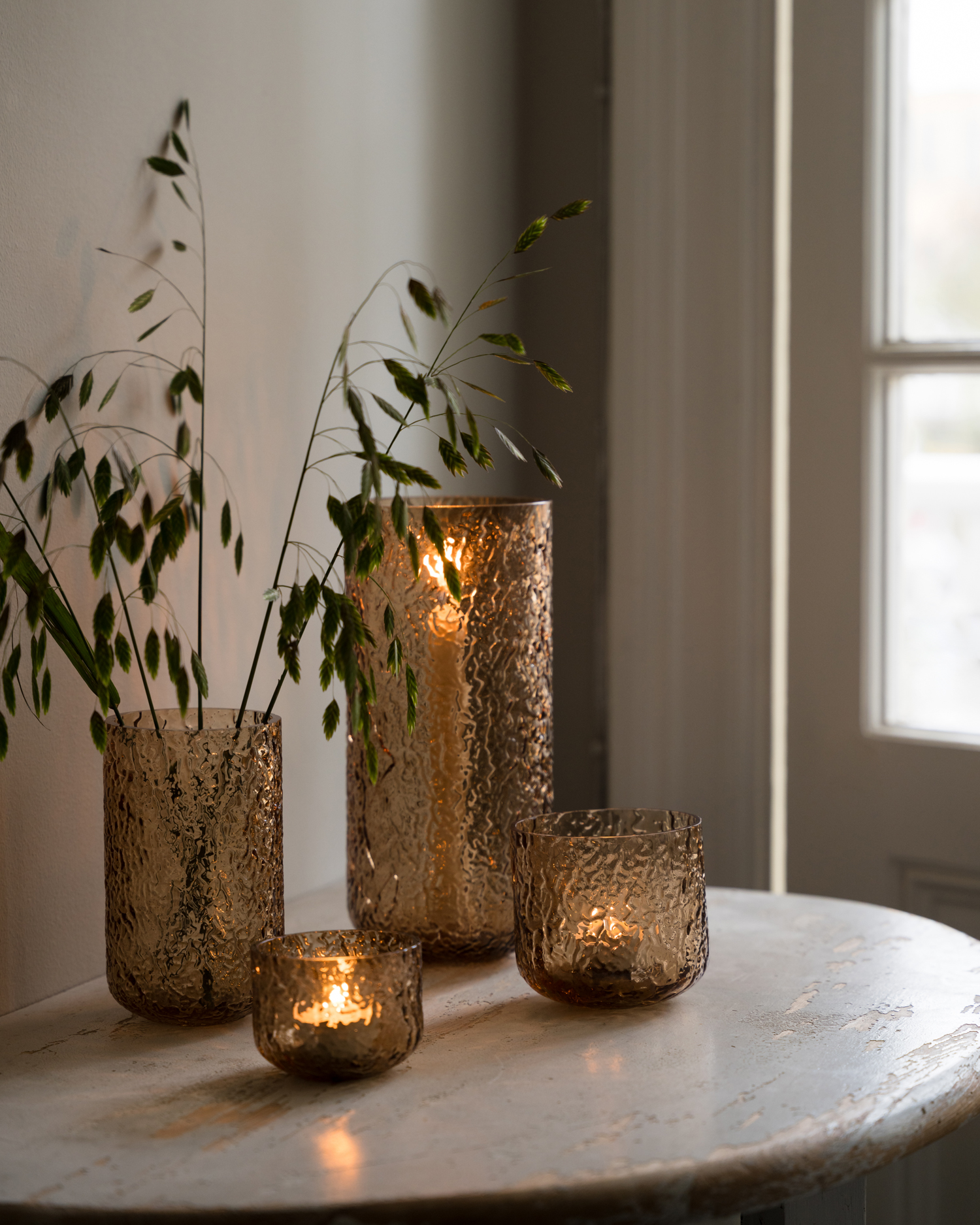 ERNST glaslykta i bärnstensfärgat glas – en vacker detalj som både lyser upp ditt hem och kan användas som vas för dina favoritblommor.