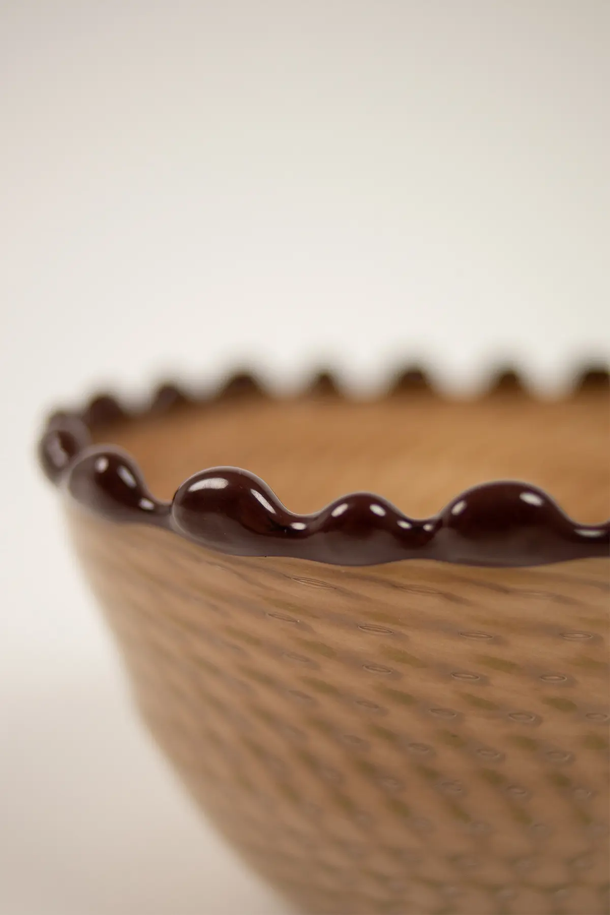 Lekfull skål med dekorativa prickar längs kanten. En enkel men vacker skål, idealisk för servering av små tilltugg.Material: GlasMått(cm): Diameter: 19 Höjd: 12Skötselråd: Handdisk