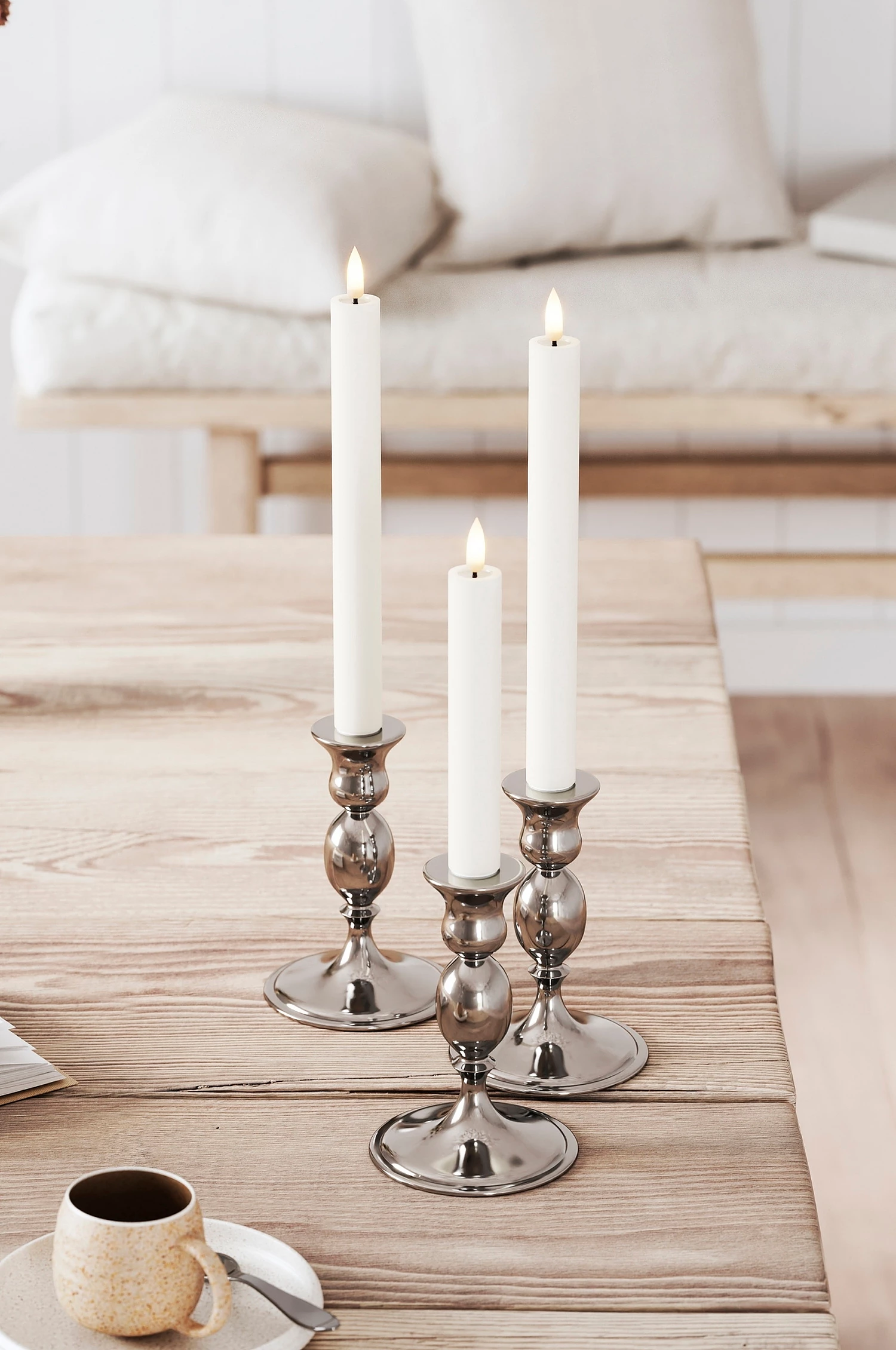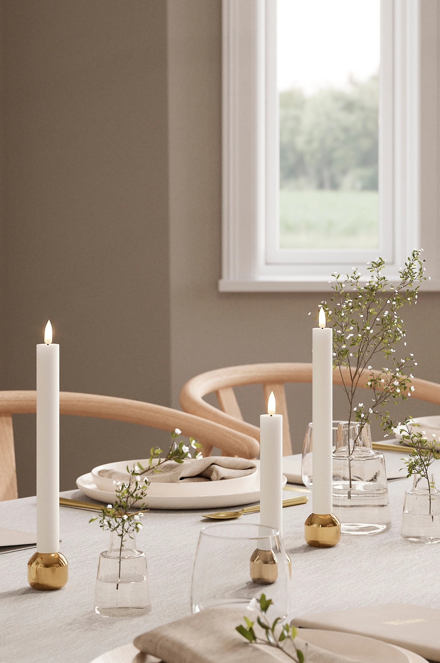 Elegant LED-kronljus med verklighetstrogen 3D-låga och “Real Stearin” yta för en autentisk ljuseffekt. Tillverkat av stearin och harts med den karakteristiska glansiga toppen som imiterar smält stearin. Utrustat med på/av-knapp undertill och kompatibelt med fjärrkontroll (säljs separat) med timer på 2, 4, 6 eller 8 timmar. Drivs av 2 AAA-batterier (ingår ej) med upp till 300 timmars brinntid. Ett säkert, sotfritt och hållbart alternativ som ger ett varmt, naturligt sken – perfekt för att skapa stämning i alla rum.