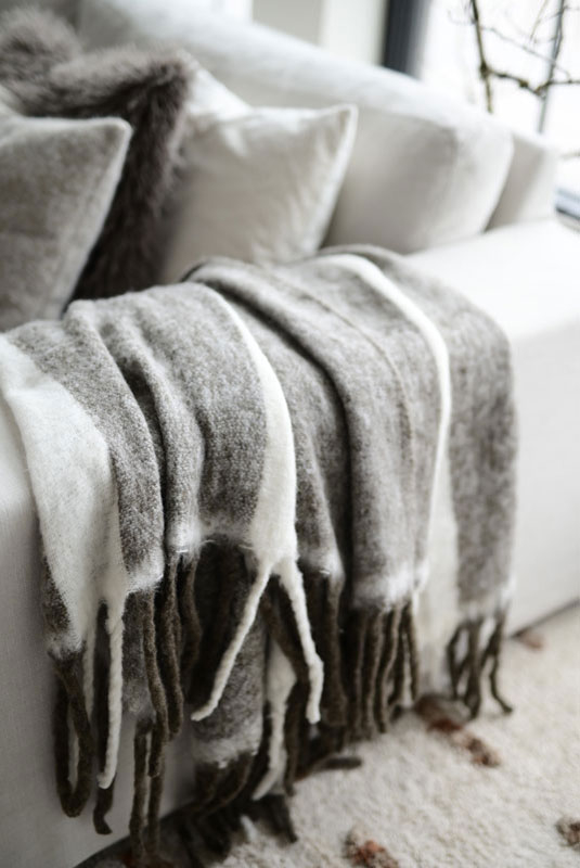 En fluffig och gosig pläd med breda ränder och tjocka tvinnade fransar längs kanterna, tillverkad i akryl och ull. Akrylfibrerna bidrar till att pläden behåller sin form och mjukhet över tid, medan ullen ger en naturlig värme och en lyxig känsla.