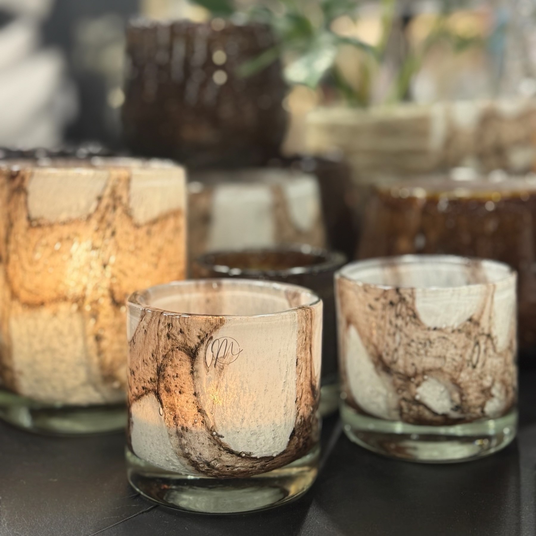 Denna handgjorda ljuslykta i vit och beige ton med subtila bruna linjer är skapad av återvunnet glas, ett hållbart val som förenar design och omtanke om miljön. Varje lykta har sitt eget unika mönster tack vare det genuina hantverket och glasets naturliga variationer.