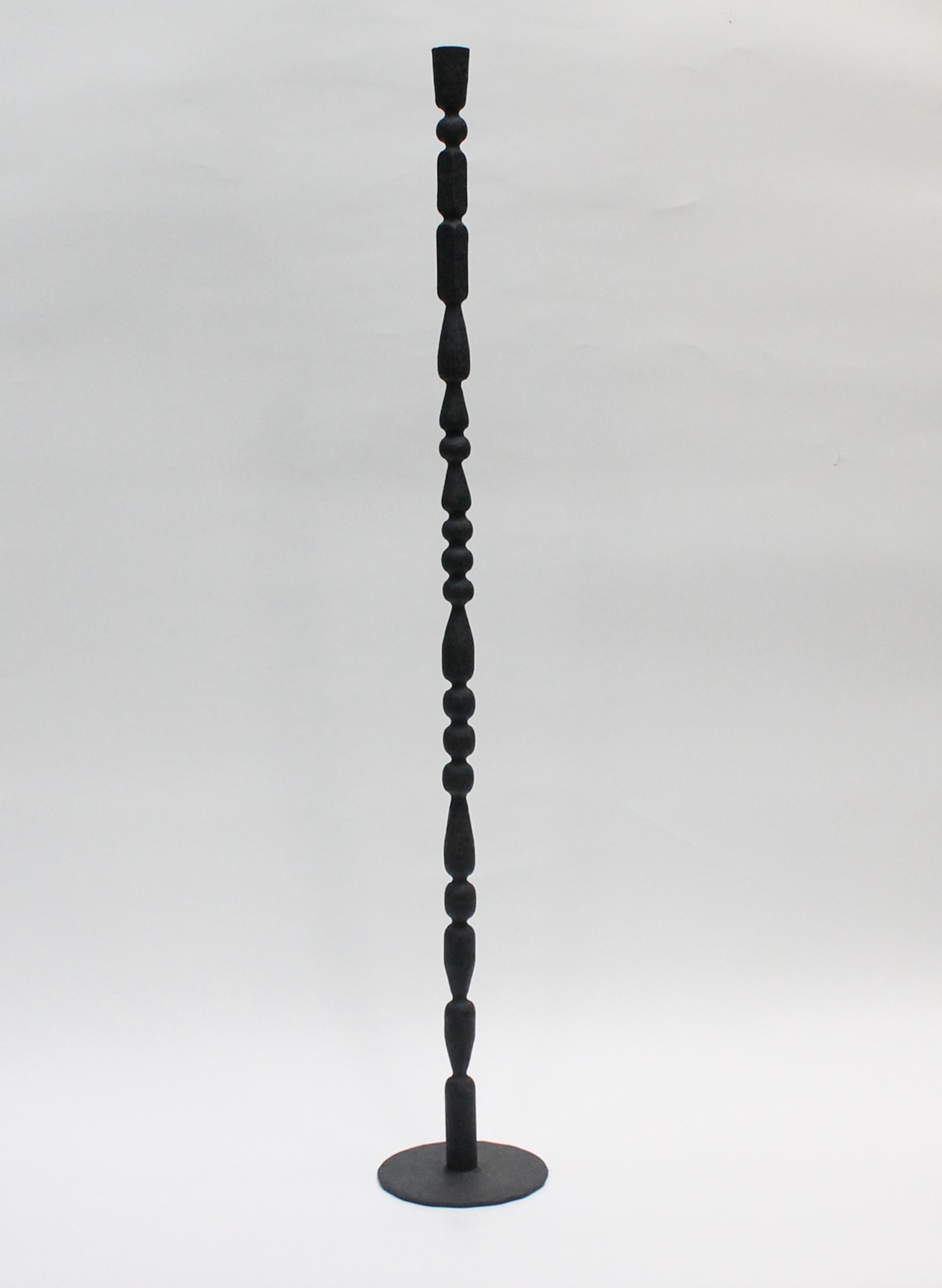 Dessa handgjorda ljusstakar i svartbränd järnfinish kombinerar skulptural design med tidlös elegans. Varje ljusstake är unikt utformad med vackert balanserade former och en matt, rå yta som ger en sofistikerad kontrast till levande ljus.