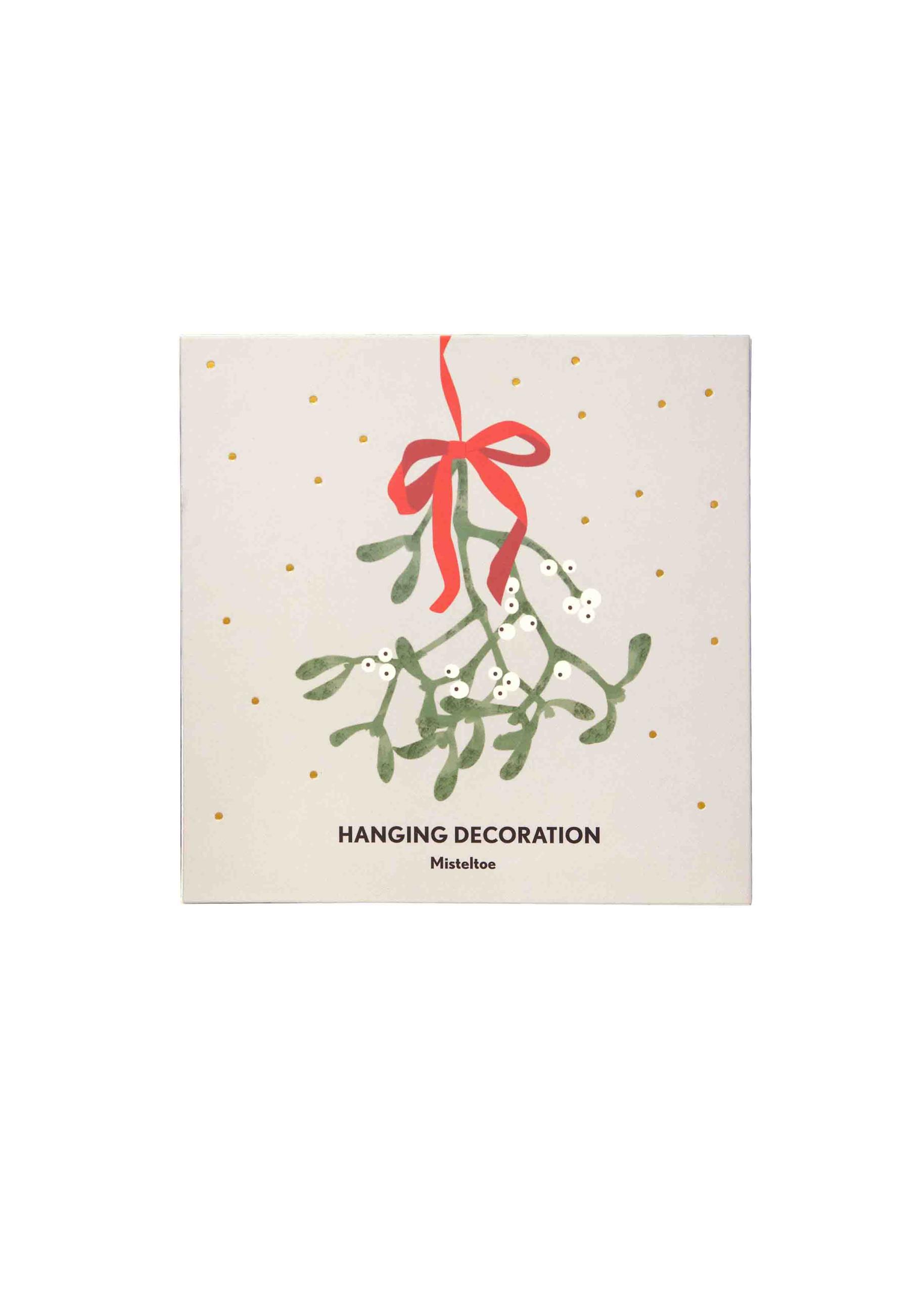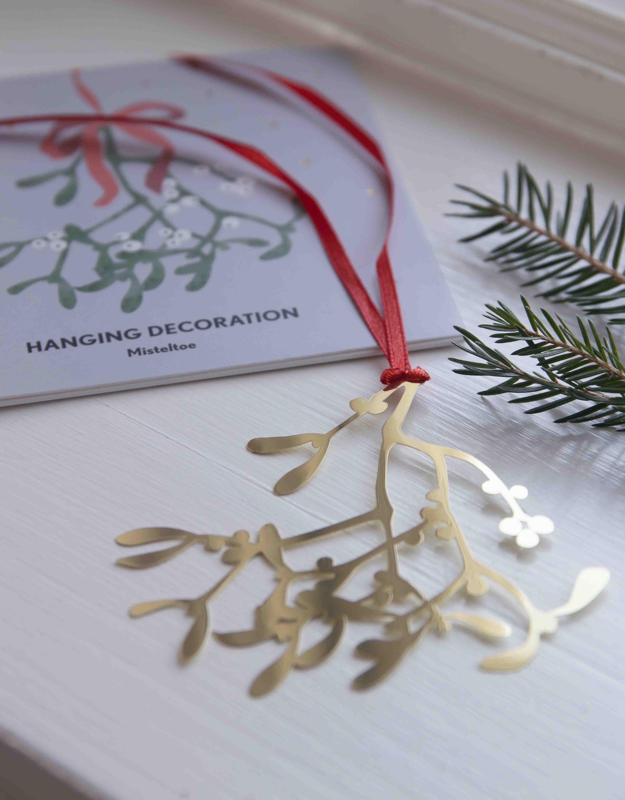 Ett elegant hänge i guldfärgad metall, formad som en stiliserad mistel i siluett. Perfekt att hänga i dörröppningen, julgranen eller i ett fönster.